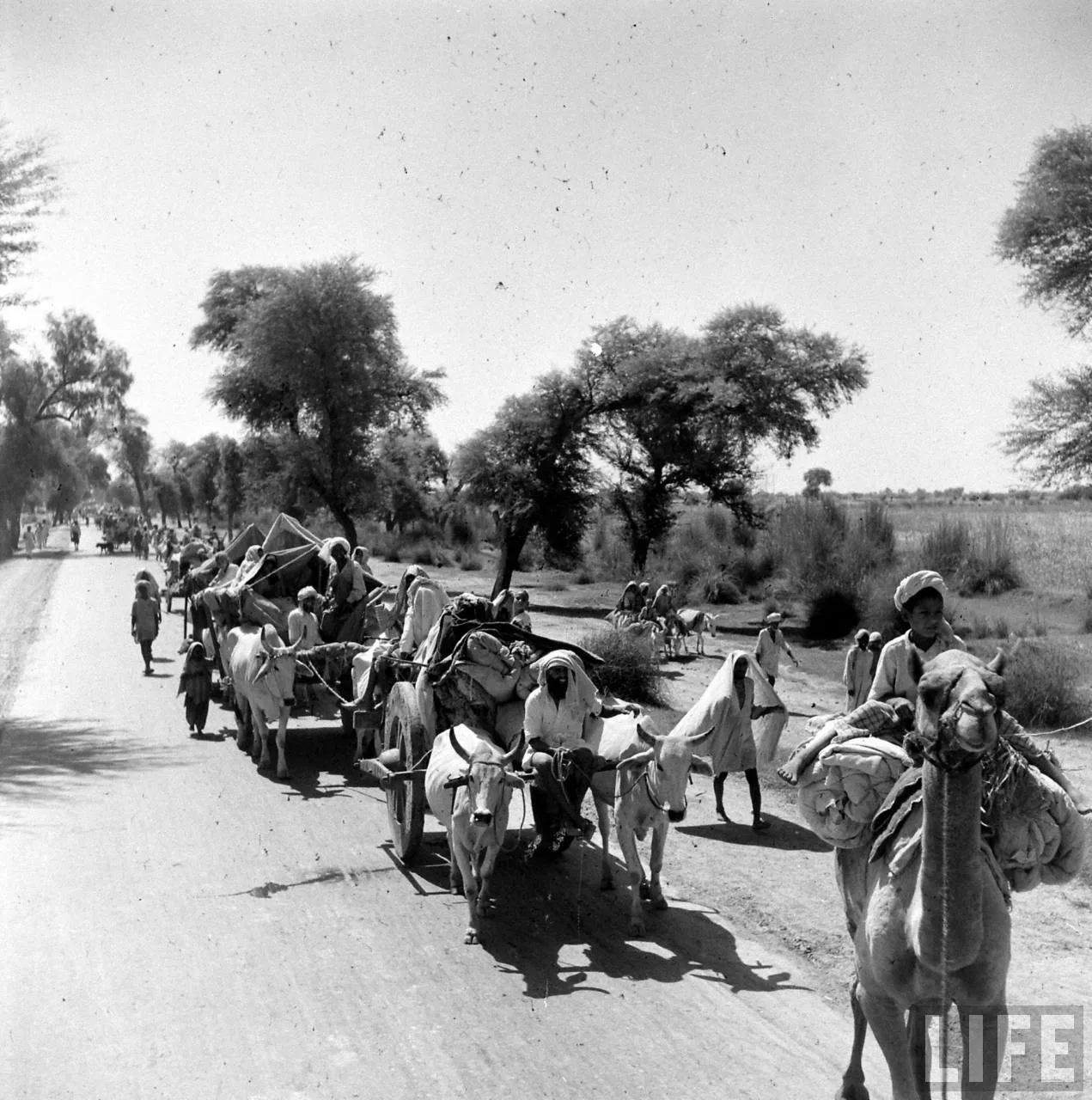Sikh carrying his wife on his shoulders as he walks with others migrating to their new homeland after the creation of Sikh and Hindu section of Punjab India due to the division of India.