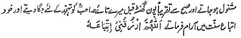 I have heard my father relate that my grandfather’s routine was very similar. My father would remain busy with his studies until an hour past midnight when my grandfather would wake up, insist on my father’s going to sleep and himself would stand up in tahajjud salah. He would wake up my father’s elder brother three quarters of an hour before fajr and would himself he down for a while in obedience to the sunnah.